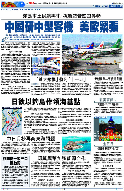 德國之聲7日報道說,歐洲的空中巴士和美國的波音公司對中國日益增長的市場寄予巨大希望。但是北京不願意這筆大生意任由這兩家大飛機製造商左右。中國宣佈自2010年起研製自己的大型飛機,這消息讓歐洲人感到很不是滋味。