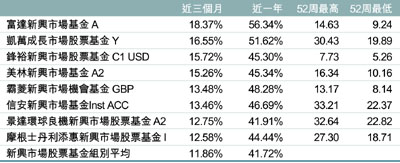 26個新興市場中,包括印度、俄羅斯、巴西、南非等16個在第四季漲至歷史新高。去年第四季度當中,多元化新興市場股票基金回報率達到7%,全年成績更是高達32%。