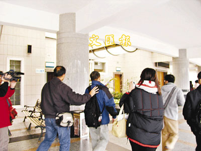 吳悅成一度用白紙遮住臉部,不肯面對鏡頭。 本報廣州傳真
