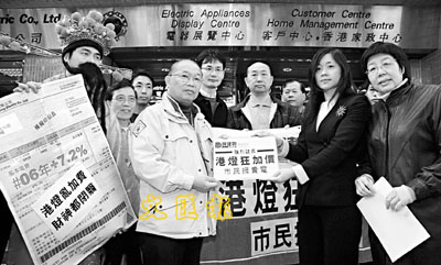 民建聯昨到港燈抗議,強烈反對該公司於元旦日起加價,蓋其在利潤管制協議下每年賺取豐厚盈利,但卻經常以燃煤及運費大幅上升作為加價理據,這種「揚蝕避賺」的手法,有隱瞞事實之嫌。 本報記者趙焜崗 攝