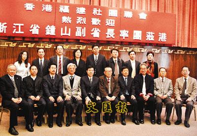 【本報訊】(記者 方德濤、沈清麗)香港福建社團聯會日前在香港中華總商會宴請由浙江省鍾山副省長率領的招商代表團。該會榮譽主席李群華、執行主席林廣兆等與鍾山副省長,分別代表香港福建社團聯會和浙江省人民政府向對方贈送禮物。