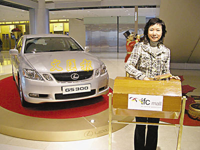 本港商場各出奇謀,國際金融中心商場不惜以重禮招徠顧客,日前舉行聖誕大抽獎儀式,決定價值48萬港元的LEXUS GS 300 Select四門智能豪華轎跑車花落誰家。凡於商場購物消費即日滿港幣2500元或以上的顧客可以參加聖誕大抽獎,以贏取LEXUS GS 300 Select四門智能豪華轎跑車一部。