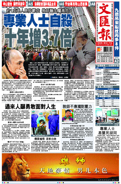 【本報訊】港大防止自殺研究中心總監葉兆輝昨日接受本報查詢時指出,雖然專業人士的自殺個案仍處於中游位置,但其升幅卻相當驚人,2003年的數字較10年前上升3.7倍。他在一電台節目中亦指出:「香港每年因專業人士自殺令香港的生產力損失了14億元,每10萬名專業人士中,便有8.6人自殺,他們多因承受不了壓力而了結自己生命,其中教師承受的壓力,比其他專業人士大。」