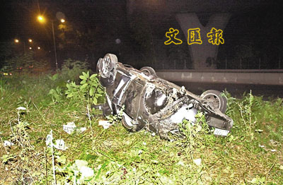 ■甲蟲車失控撞石壆後全車翻側,四輪朝天「臥」在草坪。