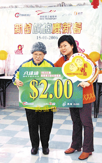 新巴及城巴代表,把印上「長者$2.00」車資的優惠卡贈予安老院的長者,提醒長者由本月底起有關優惠將會實施。