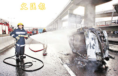 【本報訊】葵涌道昨午出現一幕冒死救人場面。一輛速遞公司客貨車失控撞壆翻側後著火猛烈焚燒,跟車工人重傷被困險葬身火海,幸千鈞一髮之際,獲司機冒死相救,險死姓歐陽(19歲)跟車工人同被送院,跟車工人頭部受傷及雙腳骨折,經送院急救後情況危殆。