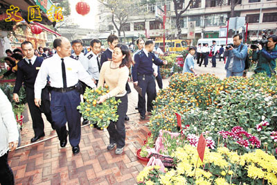 【本報訊】旺角花墟商戶連日被食環署密集式票控,引發抗議事件。昨日,食環署職員聯同多名警員再到花墟道巡視,向阻街的商戶發出61個口頭警告,但沒有作出票控。有花商表示,年近歲晚,年花需求甚大,店舖難有足夠空間擺放,故希望花墟在春節期間可列為行人專用區。
