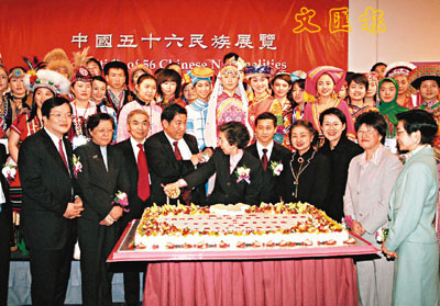 ■中國56民族展覽揭幕,拉巴平措、梁愛詩、解曉岩、范徐麗泰、伍淑清等切蛋糕慶賀。本報記者趣焜崗 攝