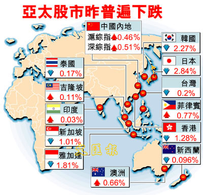【本報訊】受日本一間網絡公司被調查,日股大跌2.8%所拖累,亞太地區主要股市普遍下跌,其中港股午市急挫201點,收15,576點,跌幅1.28%,成交增至353億元。
