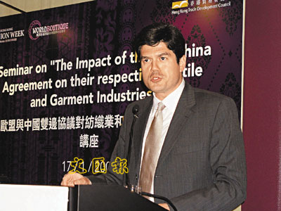 羅佳思昨出席一研討會時表示,中歐紡織品協議在2007年底屆滿,所以08年,歐盟會根據中國入世協議書第242條款,即有需要時可限制內地輸歐紡品數量,來處理中歐紡品糾紛。他亦表示,估計未來5至7年,中國將有2億人口有能力購買奢侈品,這將是歐盟一大市場,會十分重視內地市場。