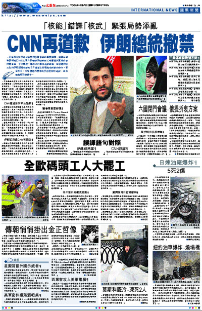 正當西方與伊朗就核問題引發爭執的緊要關頭,美國有線新聞網絡(CNN)上周六卻錯譯伊朗總統艾哈邁迪內賈德的核問題言論,平添風波。雖然CNN事後道歉認錯,但仍遭伊朗文化與伊斯蘭指導部前日下達禁止其到當地採訪的命令。直至昨日,艾哈邁迪內賈德表示接受對方道歉,並去信當局取消禁令。