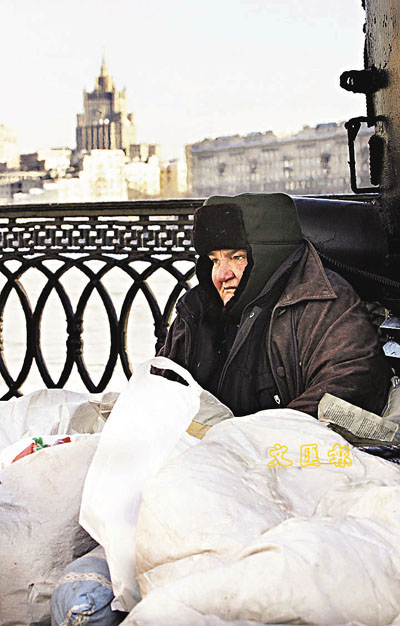 ■流浪婦人在莫斯科河岸用塑膠袋遮身取暖。 法新社
