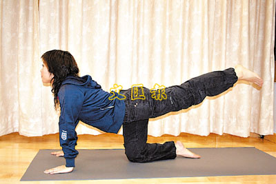 ■可紓緩腰痛。跪下,小腿貼在地上,雙手按在地上,支撐上半身,俯前,腰挺直。如想變化,可將右腳拉直,停在半空。每次停頓約5至10次調息。然後換邊。