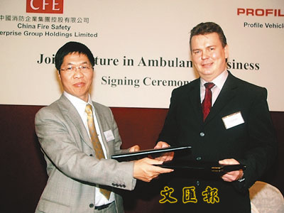 【本報訊】(記者 俞鯤)中國消防(8201)昨日與北歐最大救護車製造商芬蘭Profile Vehicles Oy簽約,在成都組建合資公司,投入3000萬元人民幣建設內地首間專業救護車廠房。