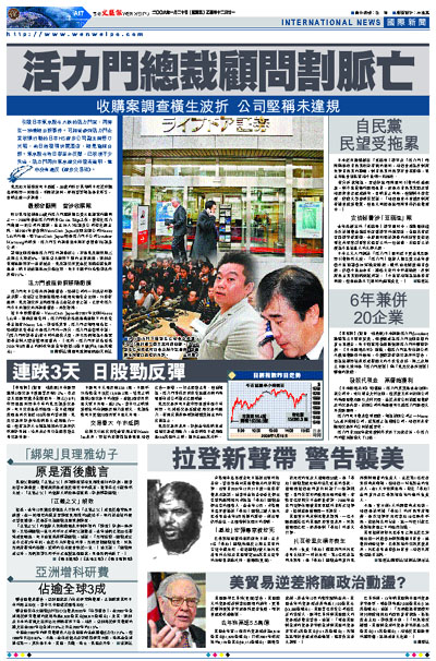 引發日本東京股市大跌的活力門案,再旁生一宗懷疑自殺事件。可能曾參與活力門企業收購行動的日本HS證券公司副主席野口英昭,前日被發現伏屍酒店,疑是割脈自殺。東京股市昨日卻意外反彈,已收復不少失地,活力門再向東京證交所發表聲明,重申沒有違反《證券交易法》。