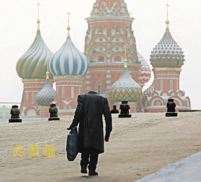 ■俄羅斯受嚴寒侵襲,一名男子行過紅場時冷得縮入衣領中,造成這幅「無頭男子」奇景。 路透社