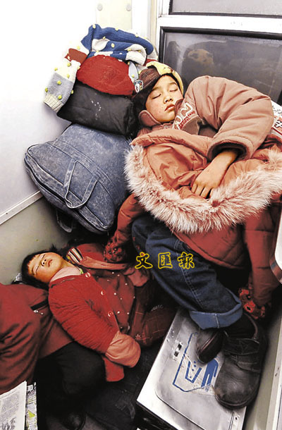 ■20日凌晨,在烏魯木齊至重慶的1082次列車上,兩個孩子在車廂之間的通道上「人疊人」進入夢鄉。 新華社