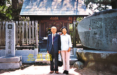 ■1994年,愛新覺羅.毓和妻子到日本辦書畫展覽,在存有溥傑夫婦骨灰的愛新覺羅社門口合影留念。
