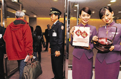 ■執行首航的華航工作人員在桃園機場手拿禮品歡迎乘客。 新華社
