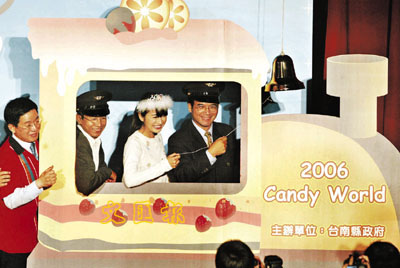 ■蘇煥智(右)剛當選台南縣長,不料又面臨賄選訴訟,若罪成,可能公職不保。圖為他16日出席一「糖果文化節」活動。 中央社