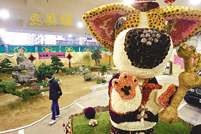 ■狗年將至,台北市花市昨日展示以4萬朵花卉、耗時5日5夜組成的金狗旺財花卉雕塑,象徵旺財納福的好兆頭。 中央社