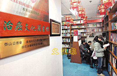 泰山公德會首創「治癌文化圖書館」,內藏2,000本相關中西醫治癌、防癌書籍,從昨日起投入服務,為癌症病人及家屬提供治癌圖書參考服務,與公德會現有的中醫服務、醫學講座和復康經驗分享互相結合。立法會主席范徐麗泰昨在開幕禮時表示,癌症病人應勇敢面對、接受診治,治療後更應「固本培元」。 本報記者張立新 攝