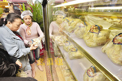 ■市民可在冷藏櫃內,選擇「合心水」的新鮮雞,過程衛生,又可不必接觸活雞。潘達文 攝