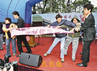 國民教育中心開幕,部分示威者衝上台。 本報記者潘達文 攝