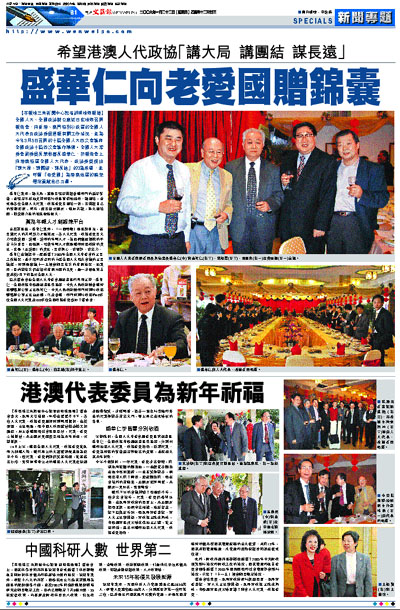 【本報珠三角新聞中心記者胡明珠海報道】全國人大、全國政協辦公廳近日在珠海召開報告會,向香港、澳門特別行政區的全國人大代表及政協委員通報有關工作情況,並為今年3月5日召開的十屆全國人大四次會議和全國政協十屆四次會議作準備。全國人大常委會副委員長兼秘書長盛華仁,於報告會上向港澳特區全國人大代表、政協委員提出「講大局、講團結、謀長遠」的3點希望,並呼籲「老愛國」為港澳地區的繁榮穩定貢獻自己力量。
