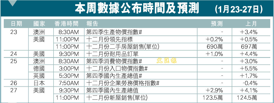 本周數據公布時間及預測(1月23-27日) (圖)