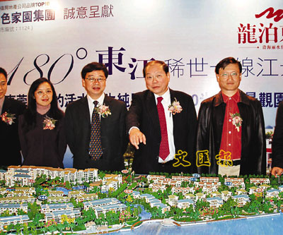 ■沿海綠色家園主席曾文仲(右二)表示,旗下東莞麗水佳園別墅單位戶戶有活水內河風景。 本報記者周穎 攝