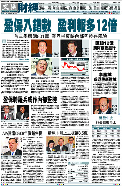 盈科保險(0065)因採用新會計準則,入帳時出現重大錯誤,以致把盈利報大逾12倍,首三季度盈利應為801萬元,而非早前申報的1.0497億元。市場人士認為,事件對盈保之資本總額、現金狀況及儲備雖無構成影響,但卻反映盈保內部監控存在風險。市場亦會更關注盈保之內部監控並出現負面反應,野村證券估計負面反應將持續6個月,調低盈保投資評級。