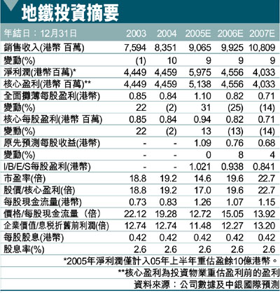 因此,我們將05-07年地產業務利潤預測分別上調2%、14%與14%至51億港幣、37億港幣及23億港幣。相應地,我們將06、07年盈利預測分別上調8%與4%。在長江實業(0001.HK/港幣82.70,優於大市)投得夢幻之城二期之後,公司計劃在06年下半年推出夢幻之城三、四期及將軍澳56區。北京項目如期進行。地鐵公司的北京地鐵4號線項目已經獲得批准,該項目預計將於09年完工,而深圳地鐵5號線正在等待政府的審批。公司仍然在北京、深圳及武漢進行談判並尋求進一步發展的機會。(摘錄)