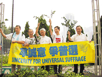 圖為2004年「七一」遊行時,黎智英、司徒華、陳日君、李柱銘、李鵬飛等揮動橄欖枝。資料圖片
