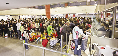農曆新年出入境高峰期由周六開始,昨天在羅湖管制站出境人流已絡繹不絕,故此羅湖管制站將於日內加設10條e-道,達68條,疏導人潮。本報記者劉國權 攝