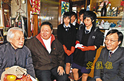 民政事務局局長何志平(左二)昨日與義工隊一起探訪灣仔區的一位獨居長者,其間義工隊更為長者清潔家居。灣仔民政事務專員袁貞爾(右一)亦有到場。新聞處圖片