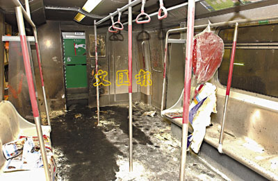 當日於金鐘站被縱火的地鐵車廂,燒至焦黑一片,滿目瘡痍。 資料圖片