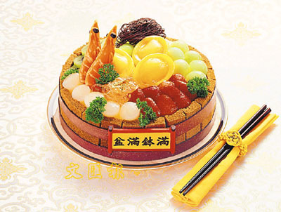 喜慶滿堂是滿載份量十足的「素翅」、「鮮蝦」、「鮑魚」、「帶子」、「髮菜」等,十分像真,又夠派頭,令人意想不到原來是由芒果、蜜瓜、奇異果、楊梅、菠蘿、蕃茜、梨、朱古力等化身而成。就連盛載佳餚的木盆都講究過人,選用咖啡蛋糕、原味蛋糕鋪砌而成,更添盆菜風味。蛋糕夾心配以什果、忌廉,口感層次豐富細膩,如此喜慶造型選料只此一家,齊來起筷吃個痛快!
