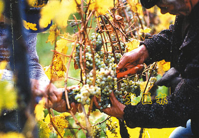 原來所謂手摘,也是借助工具,略有插花藝術的人士,都會知道有一種「大力剪」是可以利用來修短花枝,輕易便可以剪成理想的長度。酒農也是利用這種大力剪來作工具,先用另一隻手掌將整串葡萄承托,在其末端以剪剪下便是,再將葡萄串輕輕放在藤(草)籃之內,到一定份量後便放進車內運回酒廠壓搾便可釀酒。
