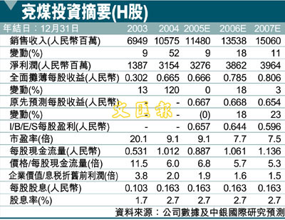 在近期召開的煤炭訂貨會上,公司未能與電廠就06年新的國內合同價格達成協議,這主要是由於雙方價格預期相差甚遠。雖然談判還會拖延一段時間,但最糟糕的情況應該是合同價格基本持平,與我們的假設一致。不過,考慮到內地合同公司的平均煤價與現價之間100人民幣/公噸的價差,公司最後能夠爭取到較高的合同價格也並不令人意外。如果內地合同價格上升,那麼我們還有可能上調預測。我們預計06年內地現貨煤價將同比下降5%,不過在近幾個月的旺季中價格仍保持穩定。