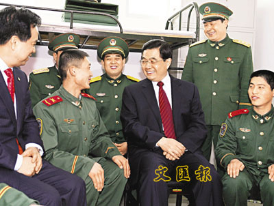 ■胡錦濤在武警延安市支隊一中隊一班宿舍同武警戰士親切交談。 新華社