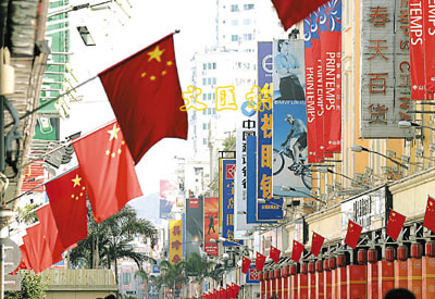 ■廈門市商家紛紛張掛國旗,喜迎佳節。本報記者米南 攝