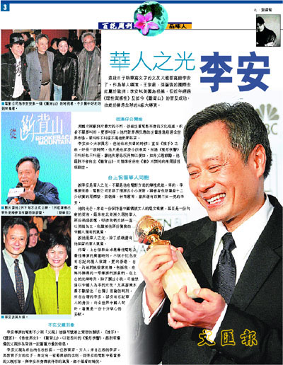 你看,上台領取金球獎最佳電影及最佳導演的興奮時刻,不慌不忙也沒有忘記向親人致謝,更向香港、台灣、內地同胞致意祝福。告訴我,在海外捧獎的一眾導演們演員們,在上台的光輝時刻,除了關注小我,可曾想過以中國人為本的大我?尤其當陳水扁不斷發出「台獨」言論的時刻,來自台灣的李安,卻沒有忘記華人的身份,向全世界中國人問好,著實是一份十分窩心的安慰。