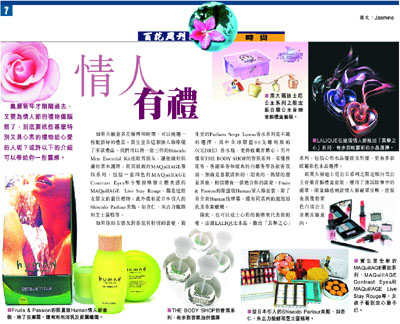 如果你的女朋友對香氛有特別的喜愛,資生堂的Parfums Serge Lutens香水系列是不錯的選擇,其中全球限量99支雕刻版的《CEDRE》香水瓶,更得收藏者歡心;另外還有THE BODY SHOP的香氛系列,有優雅花香、香甜果香和經典的白麝香等各款香氛油,無論是喜歡清新的、甜美的、熱情的還是其他,相信總有一款適合你的需要。Fruits & Passion的限量版Human情人節套裝,除了有全新Human按摩霜,還有同系列的泡泡浴乳及香薰蠟燭。