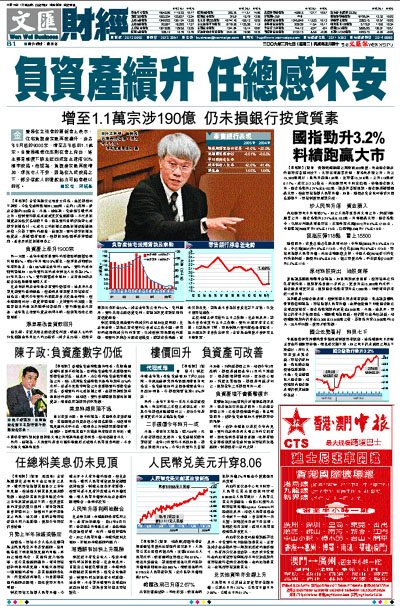 金管局在立法會的匯報會上表示,住宅負資產宗數再度攀升,由去年9月底的9000宗,增至去年底的1.1萬宗。金管局總裁任志剛在會上指出,這主要是樓價下跌及近四成業主選擇90%樓宇按揭。他認為,負資產宗數再度增加,情況令人不安,因為在九成按揭之下,部分借款人的還款能力可能會較以前低。