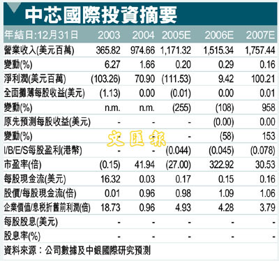 中芯國際(981)公佈,05年4季度收入同比增長7.5%至3.331億美元。淨虧損環比下降42.6%至1,500萬美元,但同比上升了33.5%。05年全年淨虧損1.11億美元,而04年淨利潤達7,100萬美元。05年4季度業績優於預期主要得益於晶圓出貨量增長高於預期以及存貨減值下降帶來毛利率上升。基於06年全年平均售價上升10%以及年底產品結構改善的預測,我們目前預計公司06年小幅盈利900萬美元。目前估值相當於1.05倍的06年1季度每股帳面價值,我們對其維持落後大市評級。我們擔憂,如果半導體行業在下半年繼續回暖,公司可能通過股權融資來提高資本支出。