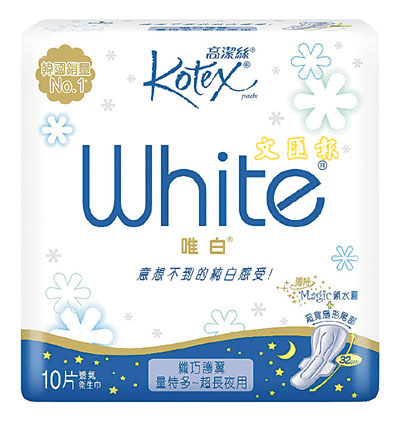 對於女性來說,每月總有幾天令她坐立不安,擔心尷尬的場面發生。全新的Kotex White衛生巾系列有Magic鎖水層,極速鎖水,比以往快2倍,讓妳跑百米也不滲漏,加上全新時尚花紋圖案包裝,時刻保持乾淨。另外,擁有超透氣呼吸底層,將濕氣呼出,趕走悶熱,讓有肌膚保持清爽感覺。這系列設有「量特多 ~ 超長夜用」裝,其32cm 超長巾身及加闊44%的超寬扇形尾部,全方位包住臀部,晚晚也可以安枕無憂,甜睡到天明。