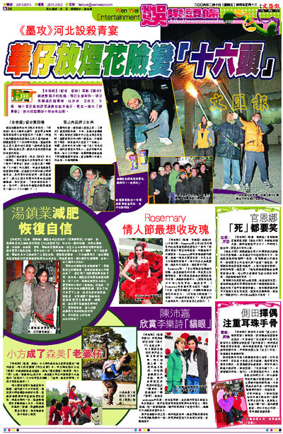 之後眾人發放煙花,寓意《墨攻》可以一炮而紅。華仔更急不及待地拿著一條又一條的「串串金」發放,及後大家一同燃點「十六頭」的大煙花,可是奇怪地煙花點後沒有反應,於是膽大的華仔便上前看個究竟,怎料華仔快走近時,煙花就發放了,威力大得令四周的汽車防盜系統都響起。華仔笑言:「幸好沒有多走一步,要不然,恐怕我的頭就好像那個煙花一樣——『十六頭』了。」