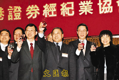 ■左三起:財經事務及庫務局常任秘書長何鑄明,香港證券經紀業協會主席艾秉禮,港交所行政總裁周文耀及證監會執行董事張灼華等嘉賓祝酒 。 本報記者張偉民 攝