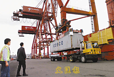 ■圖為中國遠洋運輸集團的集裝箱在美國西雅圖港口進行吊裝。資料圖片